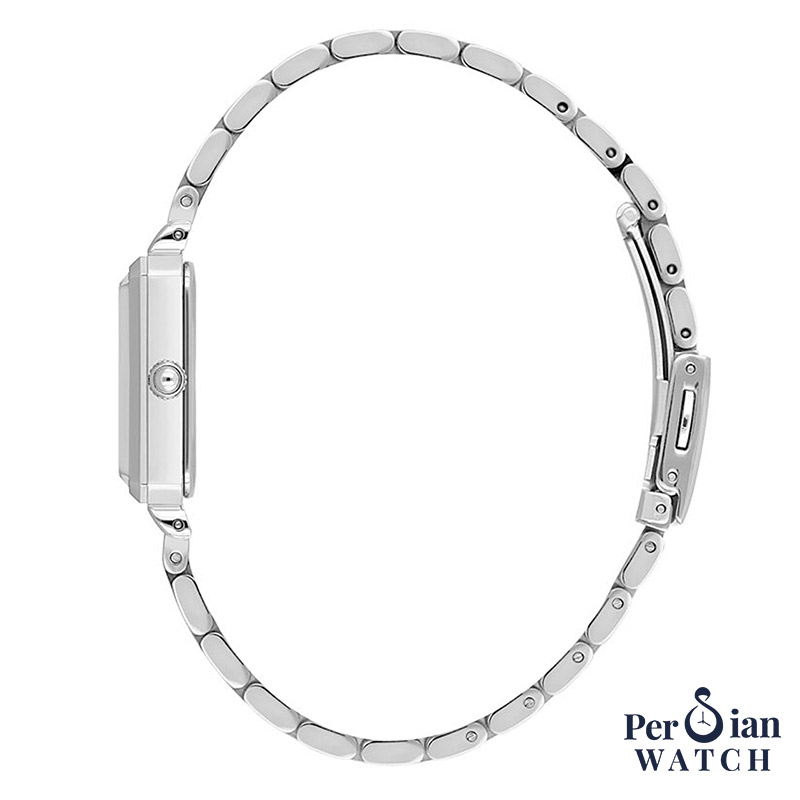 زبان طراحی مینیمال–جواهری با بند دستبندی استیل، ظاهر ساعت را تمیز و شیک نگه میدارد. فرم چهارگوش کشیده باعث میشود ساعت روی مچهای ظریف متعادل بنشیند و زیر آستین بهراحتی قرار بگیرد.