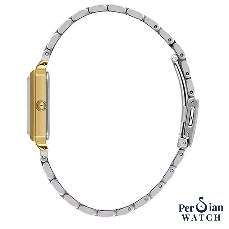 فرم مستطیلی باریک با بند دستبندی استیل دو‌رنگ، ظاهر ساعت را مینیمال و جواهری می‌کند و با زیورآلات طلایی و نقره‌ای به‌راحتی ست می‌شود. ابعاد ≈20mm باعث می‌شود ساعت روی مچ‌های ظریف متعادل بنشیند و زیر آستین به‌آسانی جا بگیرد.