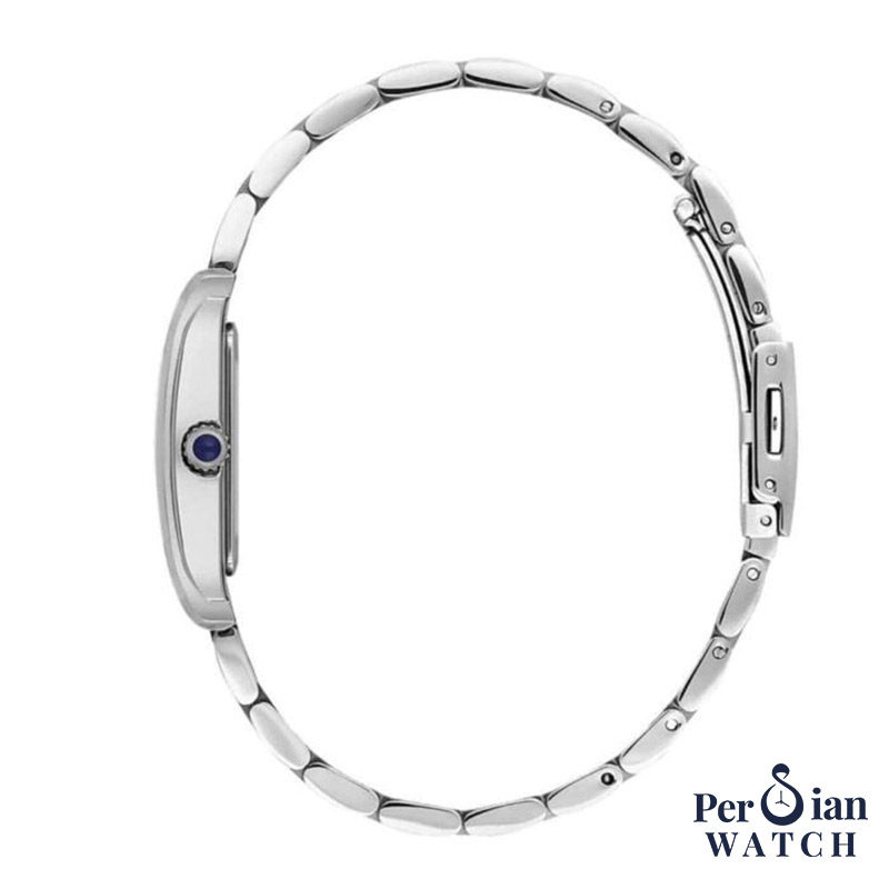 این ابعاد، ساعت را در گروه مدلهای ظریف قرار میدهد؛ روی مچهای باریک تا متوسط، قاب مستطیلی نقرهای همراه با بند دستبندی استیل، ظاهری مرتب و شیک ایجاد میکند و ساعت بیشتر شبیه یک دستبند ظریف فلزی بهنظر میرسد تا یک ابزار صرفاً زمانسنج.