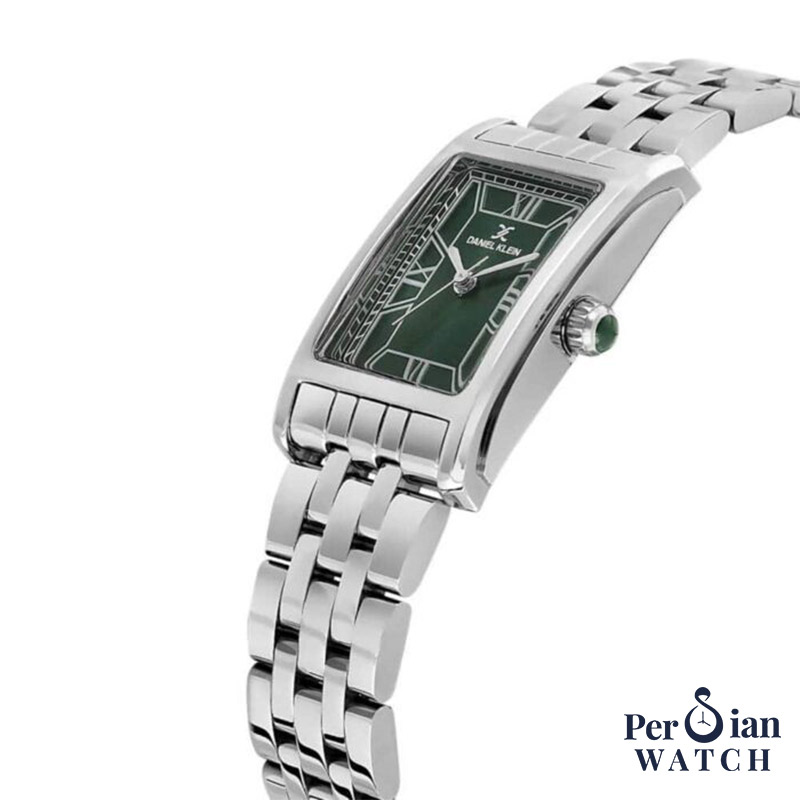 ساعت زنانه دنیلکلین DK.1.13936-2 از سری Premium با طراحی مستطیلی و ترکیب جذاب صفحهی سبز و بدنه/بند استیل نقرهای عرضه میشود. این مدل با قاب استیل مستطیلی (عرض حدود ۲۲ میلیمتر، طول تقریبی ۳۴.۴ میلیمتر)، صفحه سبز طرح Sunray، بند استیل نقرهای دستبندی، موتور کوارتز آنالوگ، شیشه معدنی و مقاومت آبی ۳۰ متر (۳ATM) طراحی شده و به همراه گارانتی یکسالهی برند ارائه میگردد.