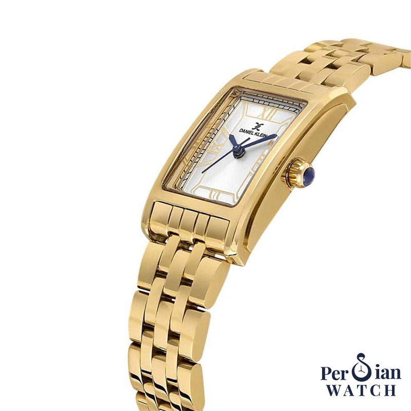 ساعت زنانه دنیلکلین DK.1.13936-3 از سری Premium با طراحی مستطیلی کلاسیک: قاب مستطیلی طلایی، صفحه نقرهای (Silver Dial)، بند استیل طلایی با فرم دستبندی، موتور کوارتز ژاپنی و شیشه معدنی. قطر عرضی قاب حدود 22 میلیمتر و طول قاب نزدیک 34–35 میلیمتر است؛ آببندی 3ATM (۳۰ متر) برای استفادهی روزمره (پاشش آب و شستن دست) در نظر گرفته شده و ساعت با گارانتی ۲ ساله عرضه میشود.