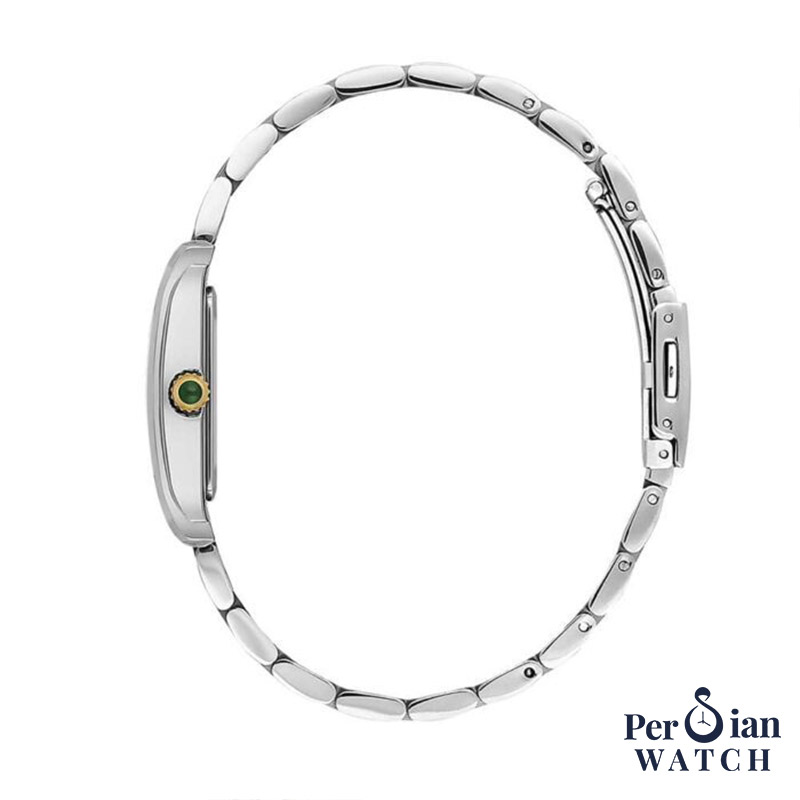 بند استیل لینکدار با دو ردیف طلایی در مرکز و لینکهای نقرهای در کنارهها، ساعت را روی مچ شبیه یک دستبند فلزی شیک نشان میدهد. این ترکیب دو رنگ، ستکردن با زیورآلات طلایی و استیل را ساده میکند و ساعت هم کنار استایلهای رسمی (کتوشلوار، مانتو اداری) و هم کنار استایل کژوال شیک خوب مینشیند.
