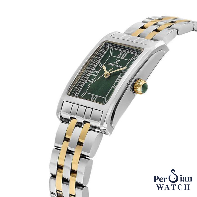 ساعت زنانه دنیلکلین DK.1.13936-5 از سری Premium، یک مدل مستطیلی ظریف با صفحه سبز و بند استیل دو رنگ (نقرهای–طلایی) است که ظاهر کلاسیک را با استایل مدرن ترکیب میکند. قاب مستطیلی استیل، صفحه سبز با بافت Sunray، بند دستبندی استیل ضدزنگ، موتور کوارتز آنالوگ و شیشه معدنی، این مدل را به گزینهای شیک برای استفادهی روزمره و رسمی تبدیل کرده است.