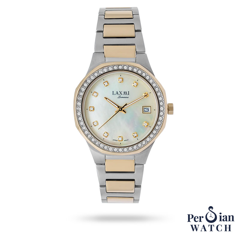 لاکسمی 8113-7 یک ساعت زنانه‌ی ظریف و شیک از خانواده‌ی Luminous است. ترکیب قاب و بند استیلِ طلایی با دیال صدفیِ صورتی جلوه‌ای مجلسی و امروزی می‌سازد که با زیورآلات طلایی عالی ست می‌شود. فرم گرد و سایز 33 میلی‌متری روی مچ‌های ظریف بسیار خوش‌نشیـن است. در قلب ساعت، موتور کوارتز ژاپنی با نمایش تاریخ کار می‌کند؛ عقربه‌ها شب‌تاب هستند تا در نور کم هم خوانایی داشته باشید. محافظت صفحه با شیشه‌ی معدنی انجام می‌شود و آب‌بندی ۳ اتمسفر استفاده‌ی روزمره (پاشش آب/شست‌وشوی دست‌ها) را پوشش می‌دهد.
